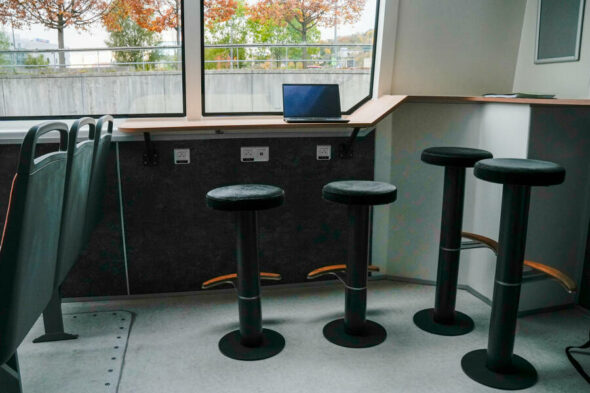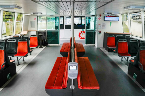 Ces nouvelles navettes proposent plus d’espace et de confort pour les voyageurs. Le salon central dispose d’une zone de travail avec connexion wifi et prises USB et 220V. De larges baies vitrées permettent de lier l’utile à l’agréable en offrant une vue sur le Vieux-Lyon, site classé au patrimoine mondial de l’UNESCO (rien que ça !). L’extérieur, quant à lui, est abrité par un haut-vent et un espace dédié permet d’installer six vélos.