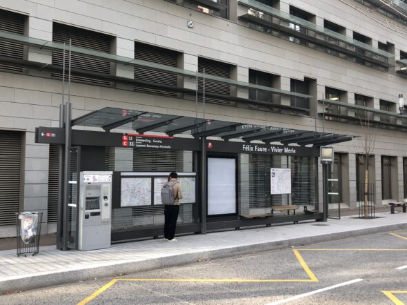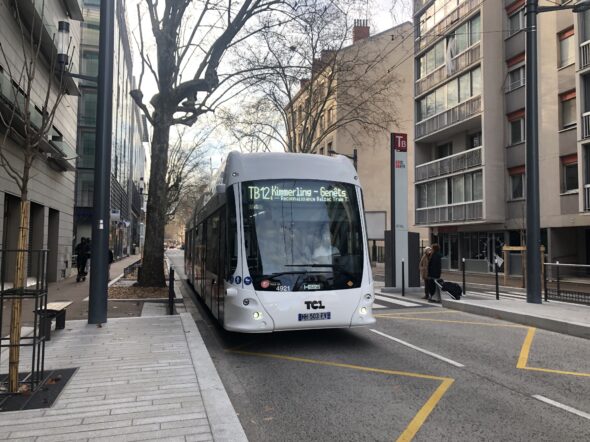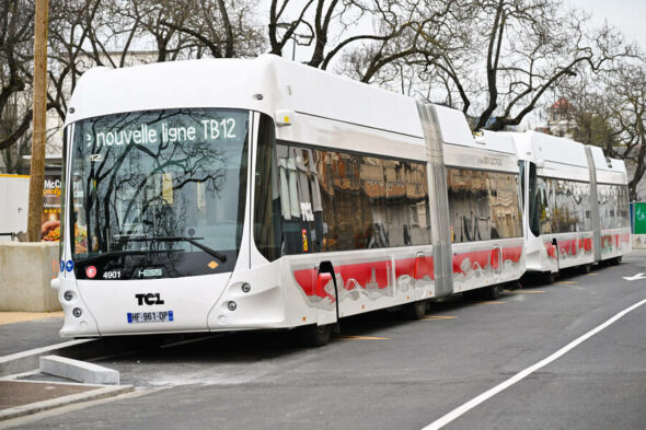 La nouvelle ligne TB12 est exploitée par des bus équipés de la technologie « In Motion Charging » avec une recharge sous lignes aériennes de contact pour une circulation autonome sur une partie du parcours.