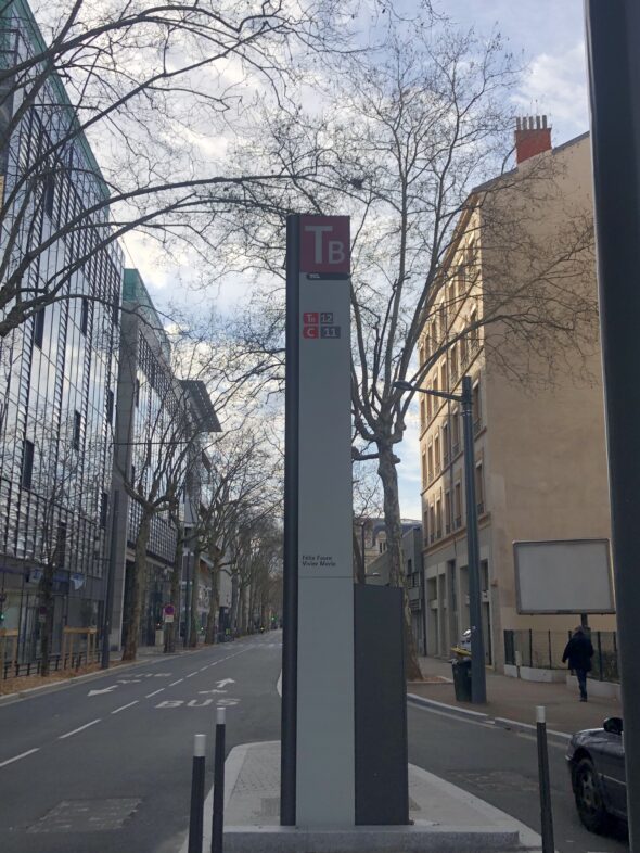 Un totem de grande hauteur avec la signalétique TB, à l’image de ceux mis en place sur les lignes de tramway, permet de repérer facilement les arrêts.